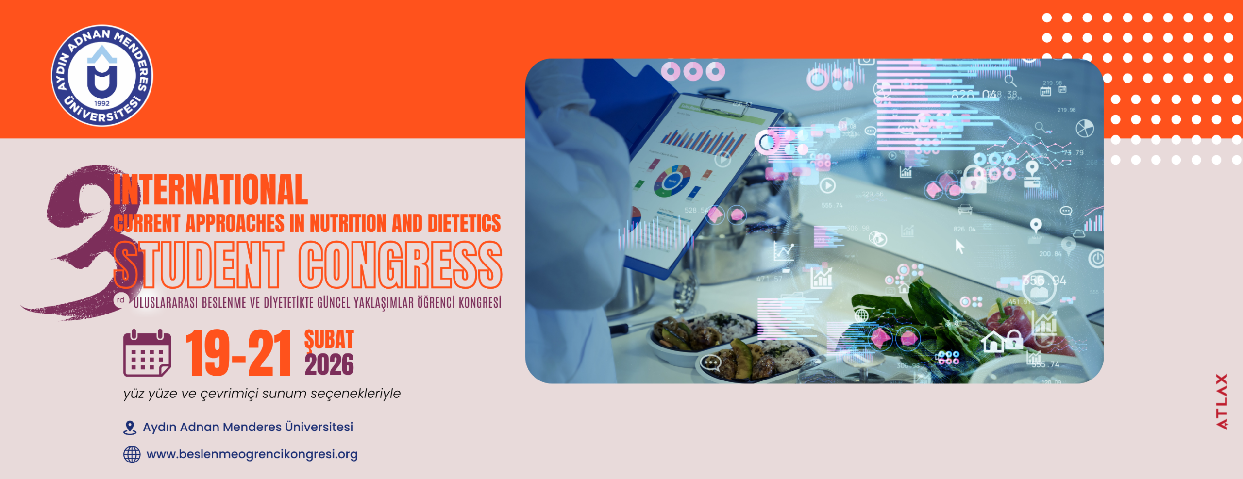 Uluslararası Beslenme ve Diyetetikte Güncel Yaklaşımlar Öğrenci Kongresi’nin üçüncüsünü, 19-21 Şubat 2026 tarihleri arasında Aydın Adnan Menderes Üniversitesi Atatürk Kongre Merkezi’nde yine büyük bir heyecanla gerçekleştireceğimizi duyurmaktan mutluluk duyuyoruz.
